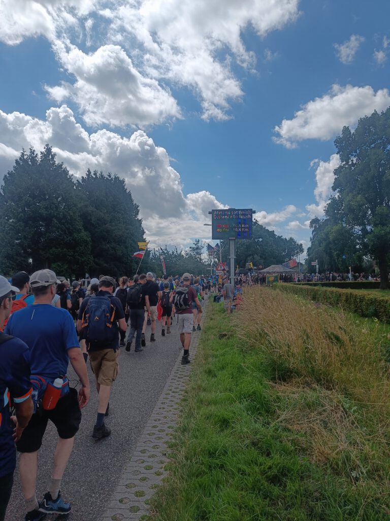 De laatste stroeve kilometers gaan door Bemmel en Lent. Hier lopen de 30, 40 en 50 kilometer routes weer samen, dus het is weer schuifelen. Dat is killing. Het kleine buitje dat nu valt, zorgt er voor dat ik m’n poncho niet voor niets gekocht heb.