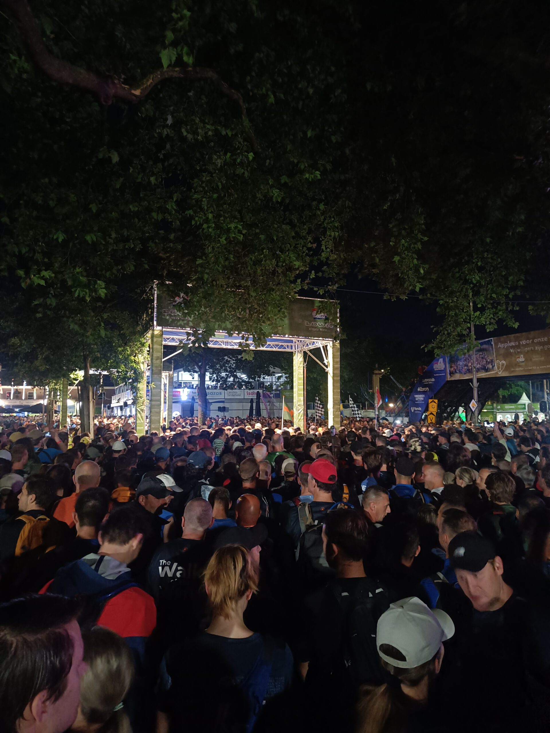 Vroeg in de ochtend staat de wekker, om 02:45. Ik heb geen goede nacht gehad. De rust heb ik gelukkig wel kunnen pakken, maar slaap amper. We schieten in onze kleren en eten gauw wat, voordat we in de auto stappen. Achterop de auto staan twee fietsen. We zetten de auto in een buitenwijk van Nijmegen en fietsen in 5 minuten naar de Wedren, de startlocatie. We staan er precies om 04:00 bij het aftelmoment. Een klein kwartier later worden wij gescand door de startscanner en kunnen we starten. In een drukke meute lopen we Nijmegen uit in het beginnende ochtendgloren. Eerst de iconische Waalbrug. Daarna slaan we af op de dijk richting Oosterhout. Inmiddels is het hier al beginnend licht. De muziek staat ook op deze vroege vroege ochtend al hard aan en het feest is er zeker al. We passeren Oosterhout rond 06:00.