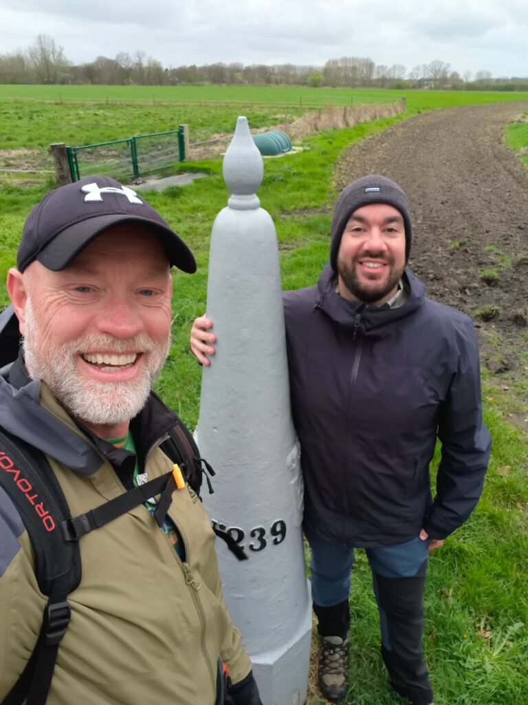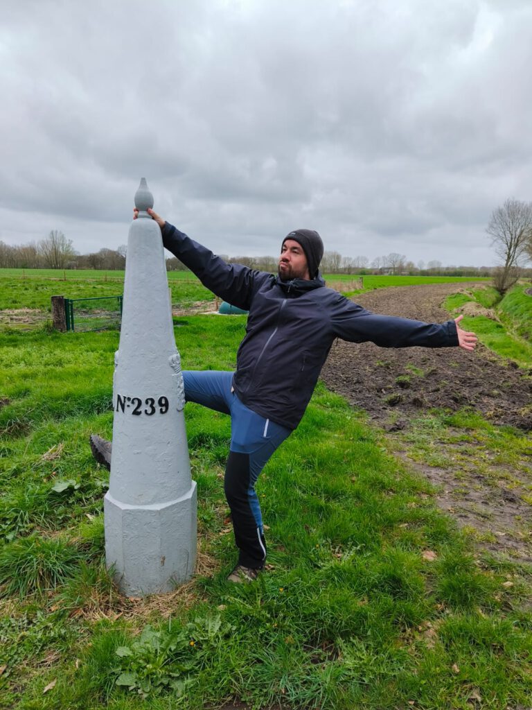 Het logistieke verhaal is achter de rug wanneer we onze wandeling starten bij station Essen. We lopen terug naar de grens en steken deze haaks over naar het dorpje Nispen. Nadat we Nispen uitlopen zien we rechts een hele grote grensovergang waar de ongebruikte douanegebouwen nog op staan. Je kunt je niet meer voorstellen dat er echt nog van dit soort grensbarrières zijn, maar kijk je naar de rest van de wereld dan is dat toch meer regel dan uitzondering. Hier is de grens gelukkig open, want tijdens de etappe van vandaag lijkt het alsof we een Wals doen met de grenslijn. Soms lopen we een paar meter aan Nederlandse zijde en daarna weer aan de Belgische zijde. We gaan nog vrolijk op de foto met grenspaal nummer 239 en ik doe er een dansje mee. Grenspaaldansen noem ik het.