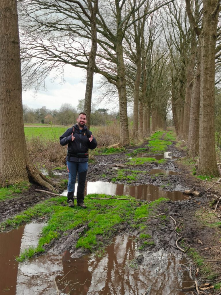 De échte blubber van deze wandeling komt nu pas. We lopen door natuurgebied de ‘Oude Buisse Heide’ en hier is het soms goed balanceren op de randjes van de paden of soms zelfs even een flinke sprong van het ene ondiepe stuk van een plas naar een ander ondiep stuk. We komen weinig mensen tegen, maar soms halen we mensen in, die we even later opnieuw in moeten halen. Niet omdat er meerdere exemplaren zijn, maar omdat wij snel lopen en een omweg maken, terwijl zij het snelle pad nemen op een langzamer tempo. Je ziet die mensen dan wel gek opkijken als ze ons nóg een keer voorbij zien wandelen. Wij lopen dan in dezelfde tijd meer dan dubbel zoveel.