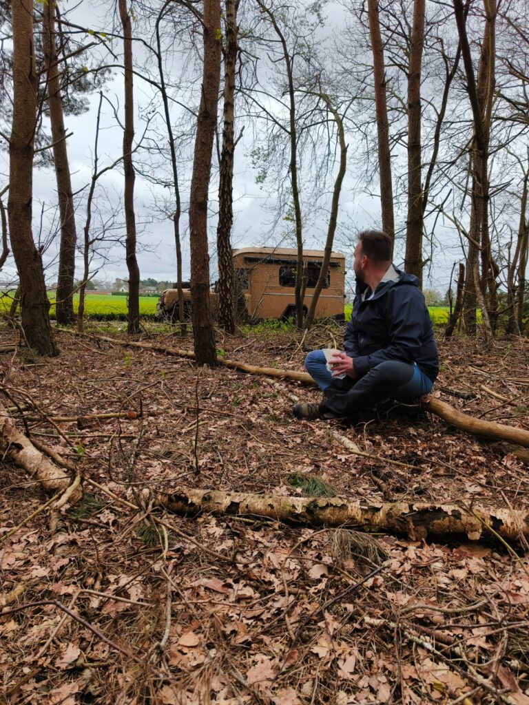 Aan de ruiters van een voorbij rijdende paardenspan, vraag ik of zij weten of er aan deze blubberige weg in de komende aantal kilometers er een bankje of picknicktafel staat, dat blijkt niet het geval en dus zoeken we een alternatief. Dat alternatief vinden we in een iets hoger gelegen bosje naast de weg. De grond is hier droog en we kunnen op een boomstammetje zitten.