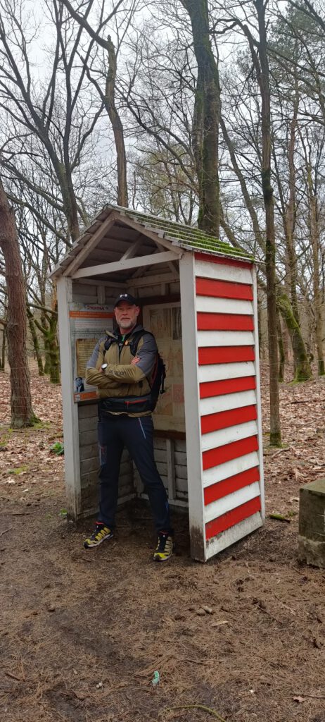 Of het de komende etappes noemenswaardig blijft wanneer we de grens passeren betwijfel ik, maar voor nu blijft het toch een momentje. Dus, wanneer we wederom langs de grens lopen en een haakse bocht maken om verder België in te lopen, wandelen we langs een bijzondere plek. Hier staat een voormalig grenswachtershutje. Echt een huisje is het niet, want er kan één persoon in staan. Het is dus meer een overkapping voor een grenswacht. Op deze plek werd er tijdens de Eerste Wereldoorlog behoorlijk wat heen-en-weer gesmokkeld. België was bezet door Duitsland en Nederland was neutraal. Op de Belgisch-Nederlandse grens was een hek gebouwd met een behoorlijk voltage: de zogeheten Dodendraad. Raakte je de kabel van het hek aan, dan overleefde je dat niet. De grensovergang was dus de enige plek waar je wél levend de grens over kon, ook als smokkelaar.