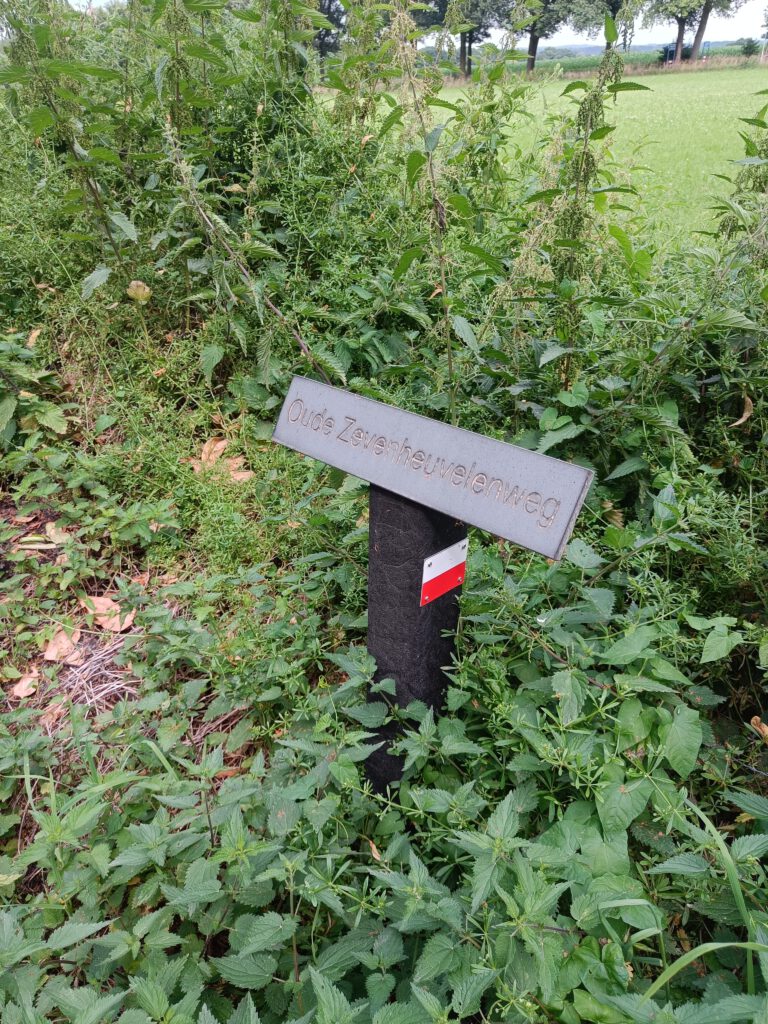 De allerlaatste ‘kuitenbijters’ liggen op ons te wachten. We beklimmen de Duivelsberg en daar slaan we af bij een bord waar we al eerder zijn geweest. Dit bord markeert het kruispunt tussen het Pieterpad, Romeinse Limespad en het Grote Rivierenpad. De laatste van die drie, hebben Ron en ik één jaar geleden gelopen, van Hoek van Holland tot aan Kleve (D). Bekende wandelgronden dus! We slaan vanaf hier het Pieterpad af om vanaf hier, wederom tegen de richting in, het Grote Rivierenpad te volgen naar Nijmegen. Nog 9 kilometer.