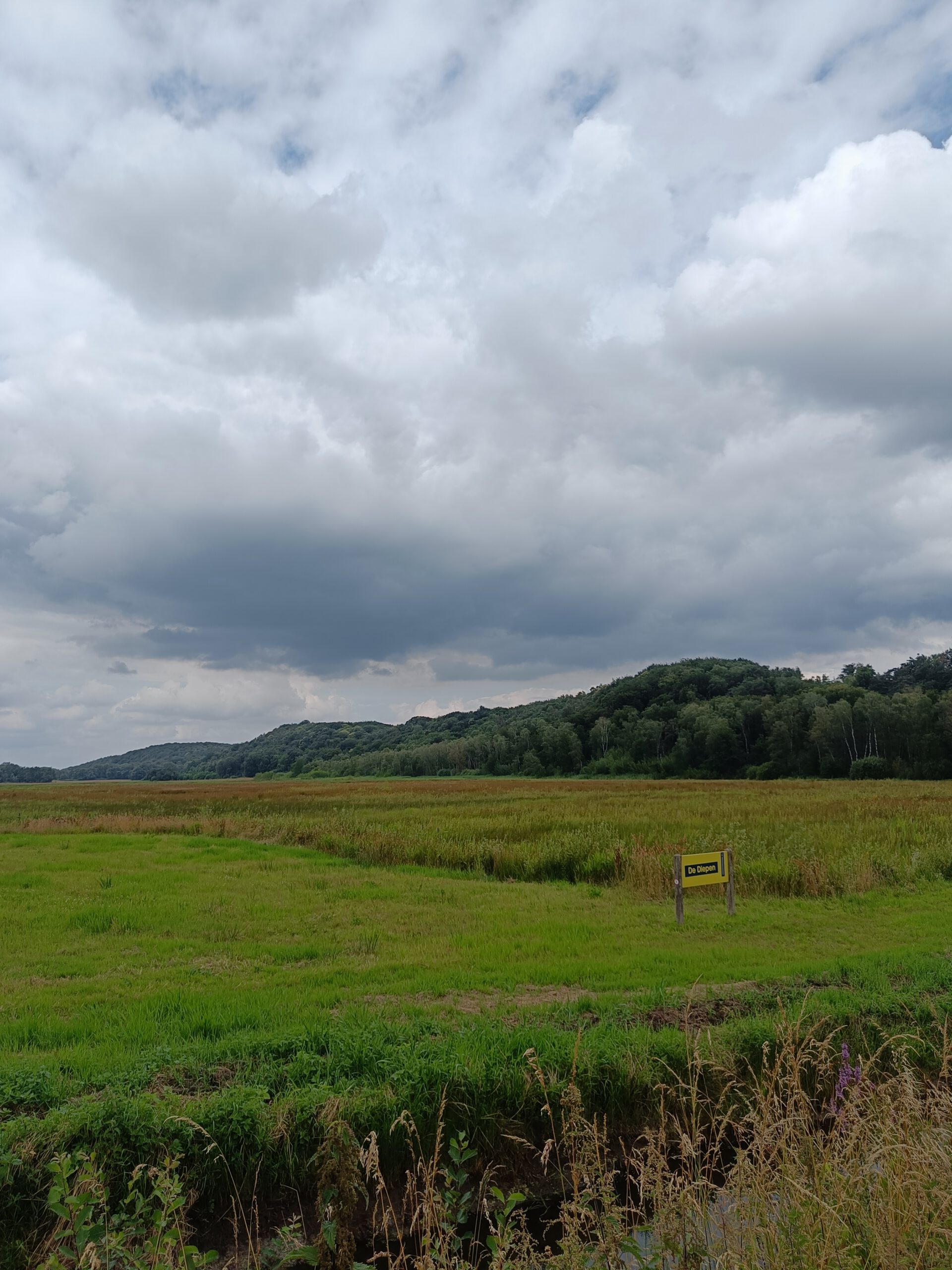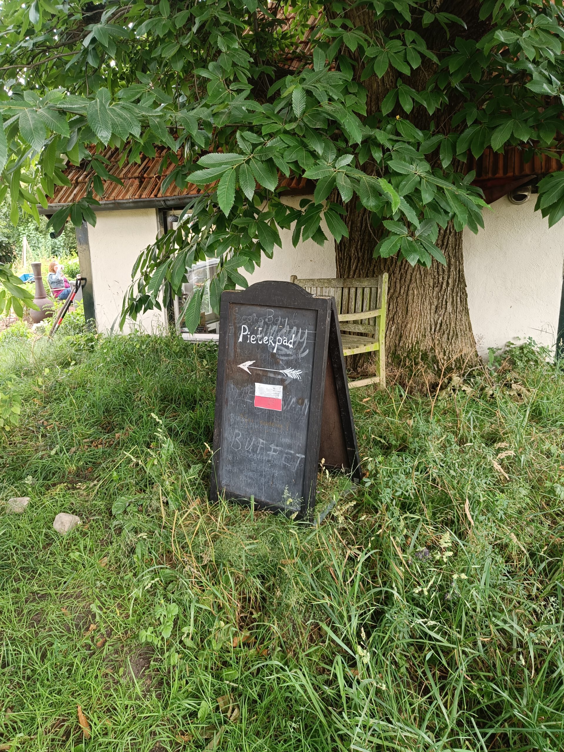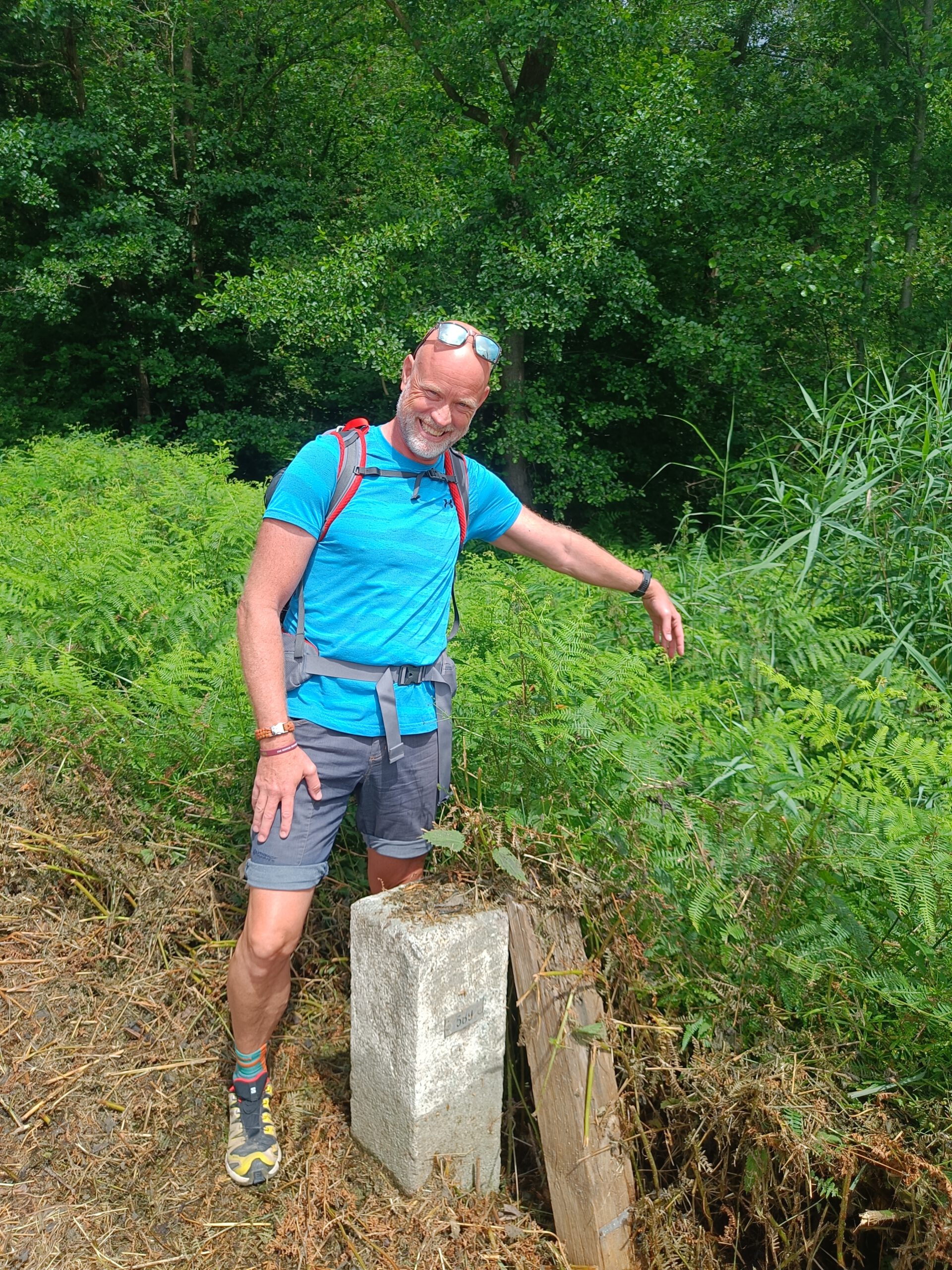 Daar waar we de Duitse grens voor het laatst tijdens deze wandeltocht kunnen aanraken, houden we onze pauze. Hier is tegelijk ook onze laatste kans voor een échte Limburgse vlaai, maar na de pannenkoek zitten we al zo vol, dat we die kans toch voorbij laten gaan. Wanneer we na onze pauze verder gaan, zet Ron nog heel even zijn voet in Duitsland, voordat we de Duitsers achter ons laten. Die voet zet hij echter midden in de brandnetels neer. Flapdrol.