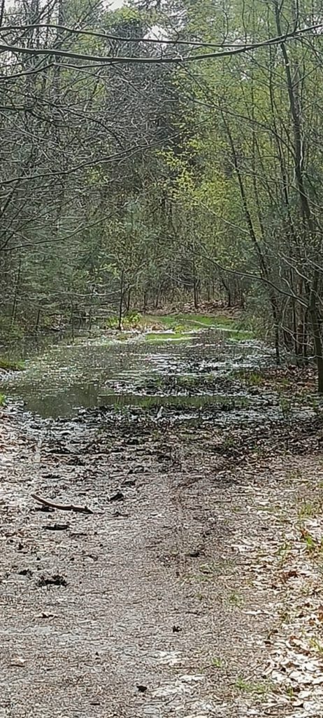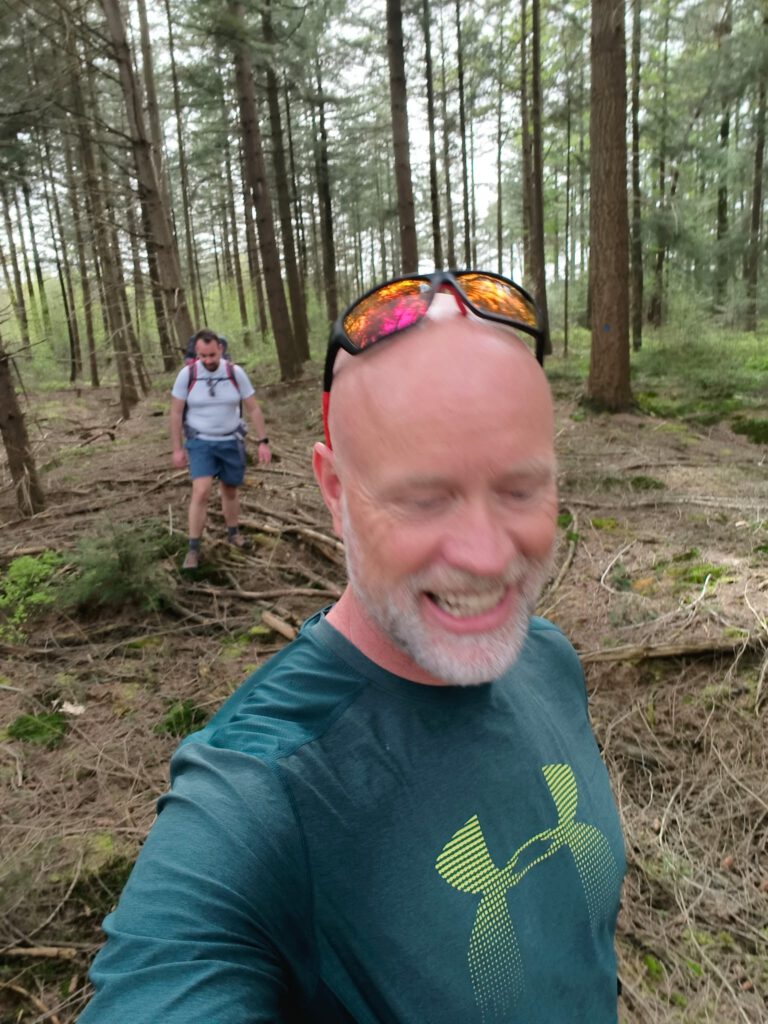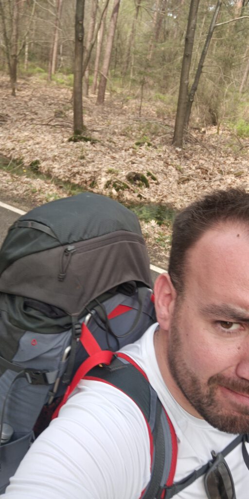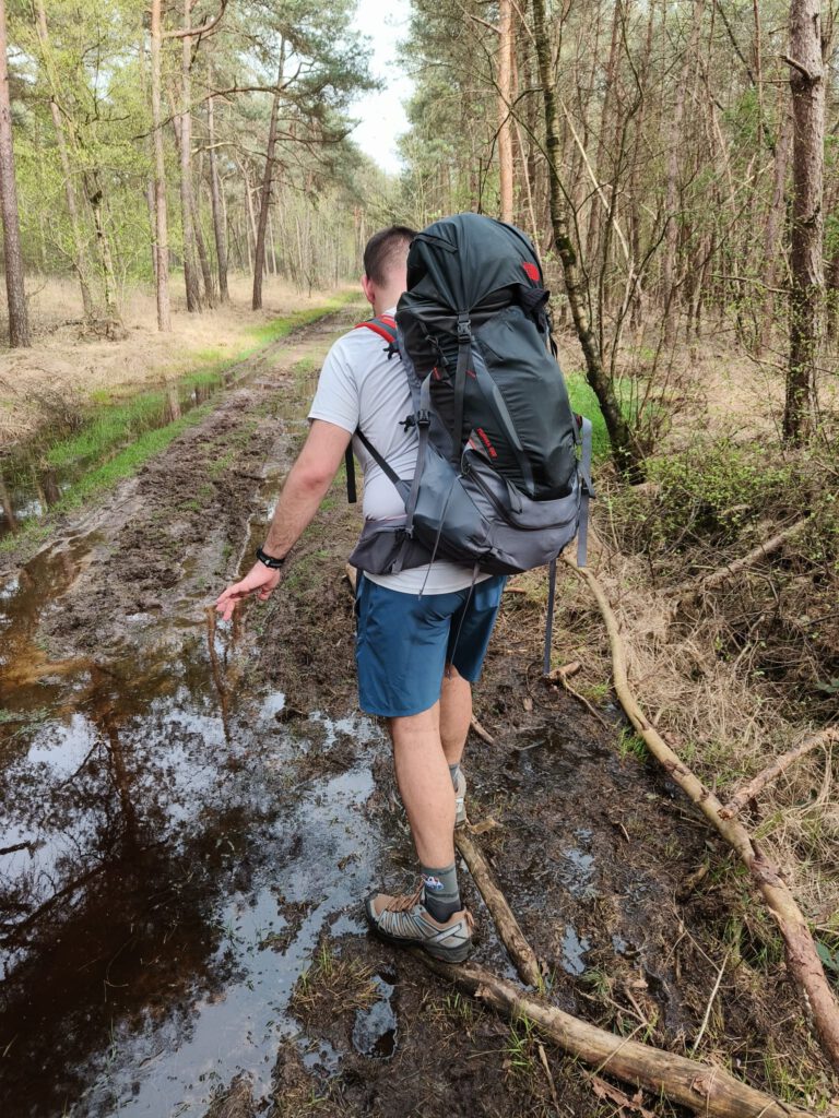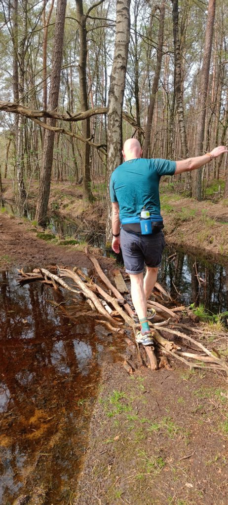Vlak na de grenspalen komen we al bij onze pauzeplek. Eigenlijk veel te vroeg in de route maar het is tenslotte al lunchtijd en met de vroege start van vandaag lusten we al wel wat. In Strijbeek laten we ons op het zonnige terras verzorgen met een twaalf uurtje en een uitsmijter. We kunnen er weer even tegenaan. En hoe. We komen door landgoederen en natuurgebieden. Strijbeekse Heide, Luchtenburg, Valkenberg, Prinsenbos, Chaamse bossen. Slingerende bospaadjes, een afwisselend schouwspel van bos, heidevelden, en indrukwekkende vennen en beken. Maar ook hier blijkt de overvloedige regenval van de laatste maanden voor veel ondergelopen paden en blubber te hebben gezorgd. We springen van droog plekje naar droog plekje. Met takken zijn er doorwaadbare plaatsen gemaakt. Soms moeten we het pad verlaten om dwars door het struikgewas een ander en droger pad te bereiken. Het lijkt soms meer op een survivaltocht dan een relaxte lange wandeling. Het is dan ook veel zwaarder lopen dan op verharde paden en wegen, vooral ook omdat we een zware rugzak bij ons hebben. We wisselen deze dan ook regelmatig onderling af.