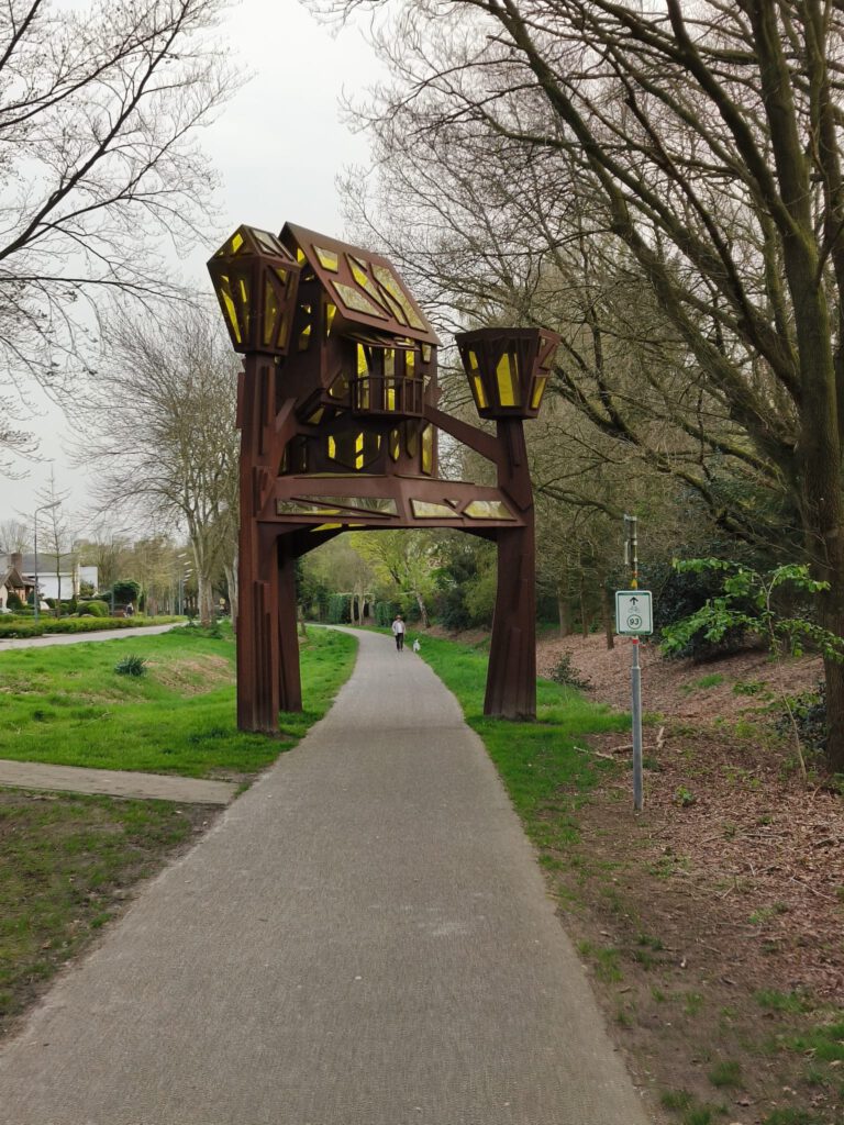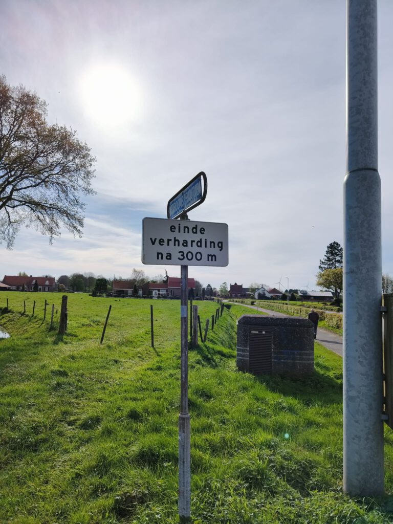 Ter hoogte van Alphen (niet te verwarren met Alphen aan den Rijn) lopen we over één van de vele onverharde wegen richting het Bels lijntje. We zien deze al in het landschap lopen want het is een overblijfsel van de spoorlijn Tilburg – Turnhout en deze ligt op een verhoging. Het is sinds 1990 een fietspad tussen Alphen en Baarle-Nassau. Het spoorlijntje heeft dienst gedaan tussen 1867 en 1982. Lopen op het fietspad is welkom na al het geblubber en geglij. En zo lopen we in de avondschemering het plaatsje Baarle-Nassau binnen.