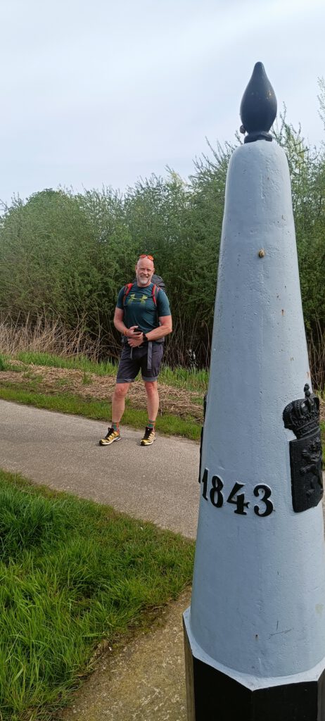 Met een uitpuilende rugzak met proviand maar ook de spullen voor de overnachting in Baarle-Nassau en alle reservekleding voor onderweg gaan we op pad. Waar we twee weken geleden gestopt waren in Rijsbergen stappen we uit de bus. De weersvoorspellingen zijn subliem. Zomerse temperaturen en zon. In de korte broek en goed gemutst gaan we op stap richting de grens en al snel doemt de eerste grenspaal op.