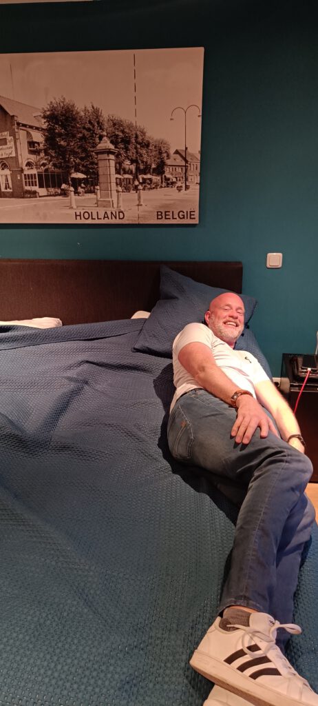 We komen uiteindelijk bij ons eindpunt voor vandaag. Hotel en brasserie “den Engel”. Het hotel blijkt in een bruisend centrum te liggen. Er zijn veel mensen op de been. Heerlijk uit eten in de vele restaurants rondom het centrum of in de bar een pintje pakken. Zoveel drukte en vertier hadden we niet verwacht. Wij willen echter maar één ding. Een douche om het stof van ons af te spoelen en de benen hoog leggen. We zijn flink vermoeid na deze etappe. Thomas grapt nog in de kamer met een foto waarin het hotel wordt gesplitst in een Belgisch en Nederlands deel. Ik word verbannen naar België en moet op het randje van het bed liggen. Terwijl 70% van het bed Nederland is en hij daar kan liggen.