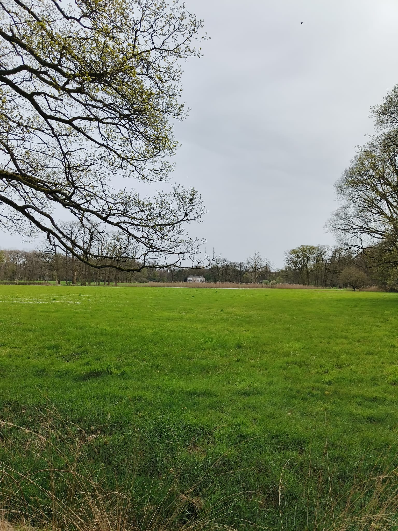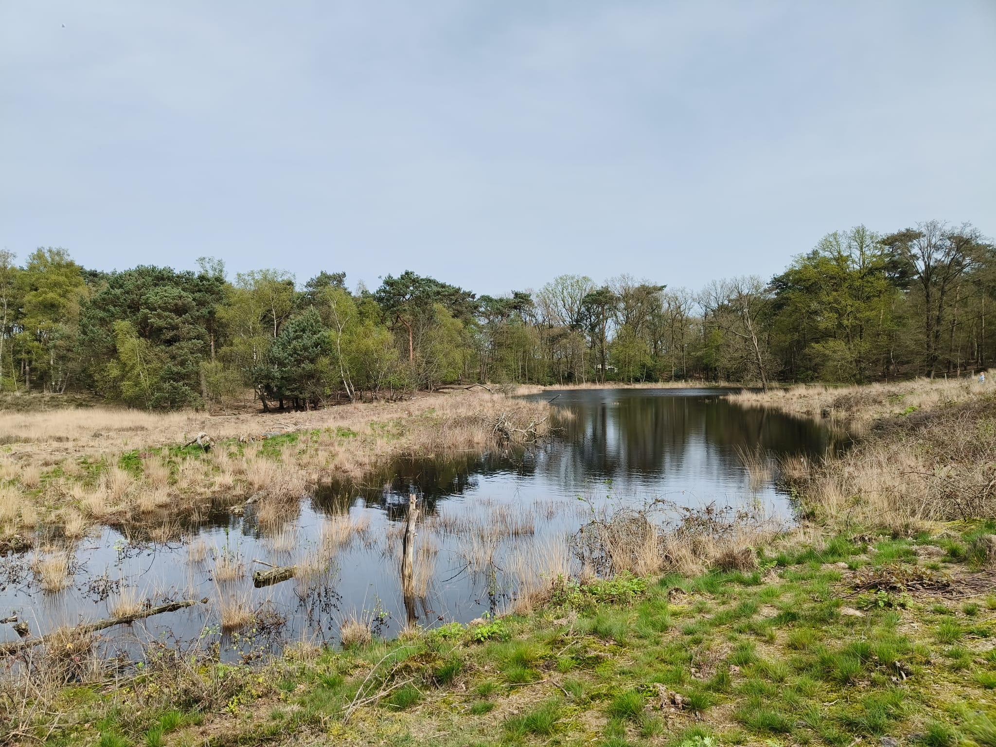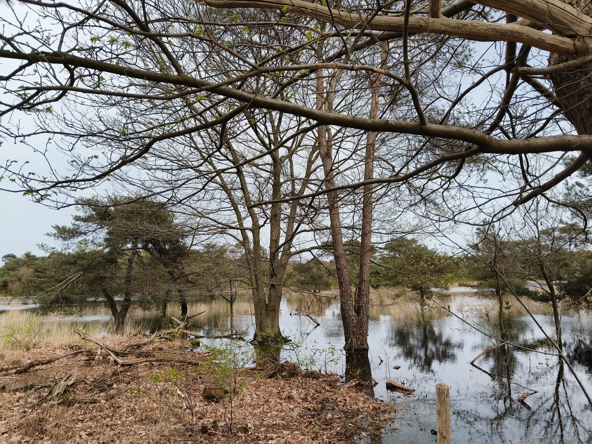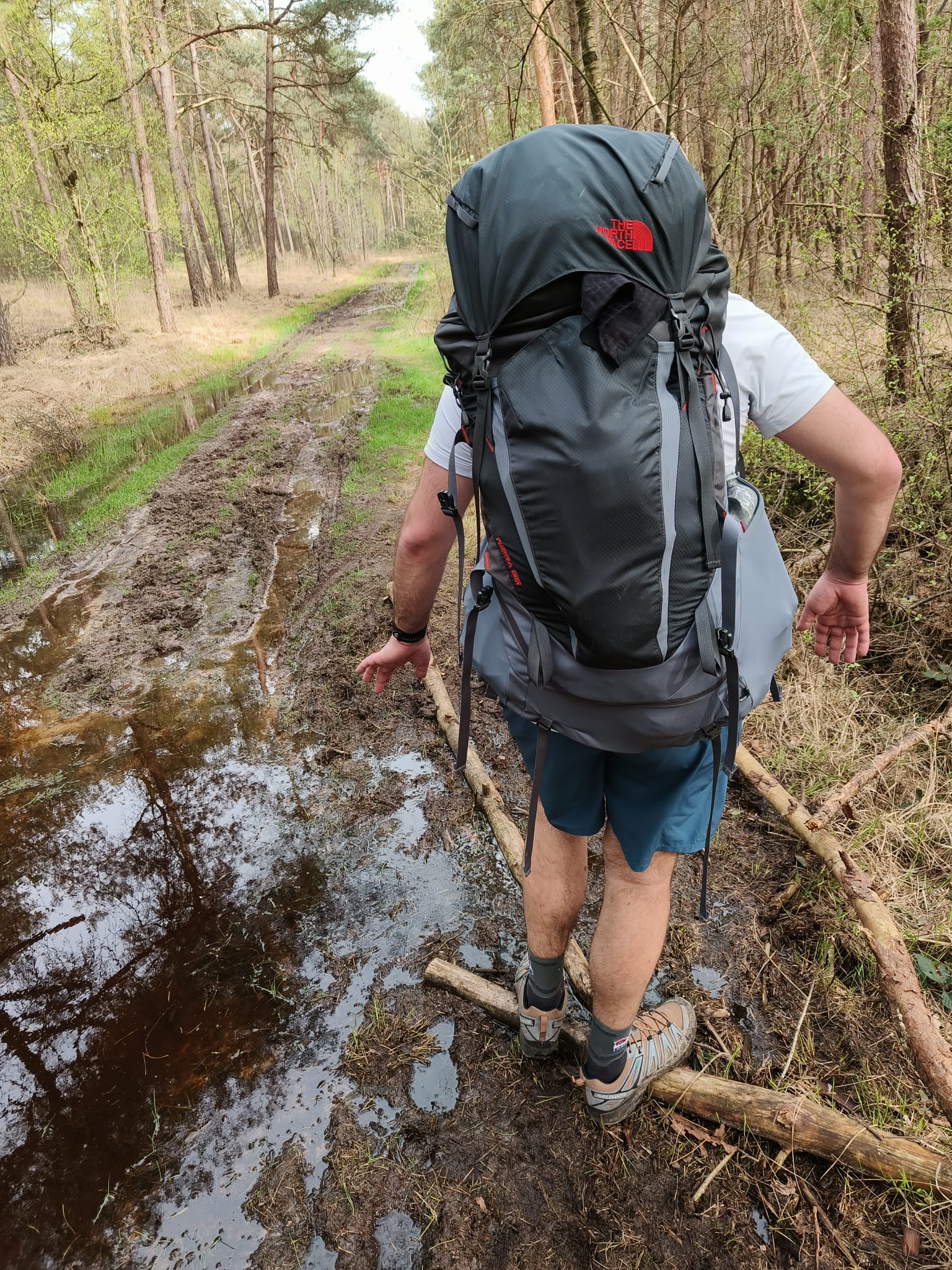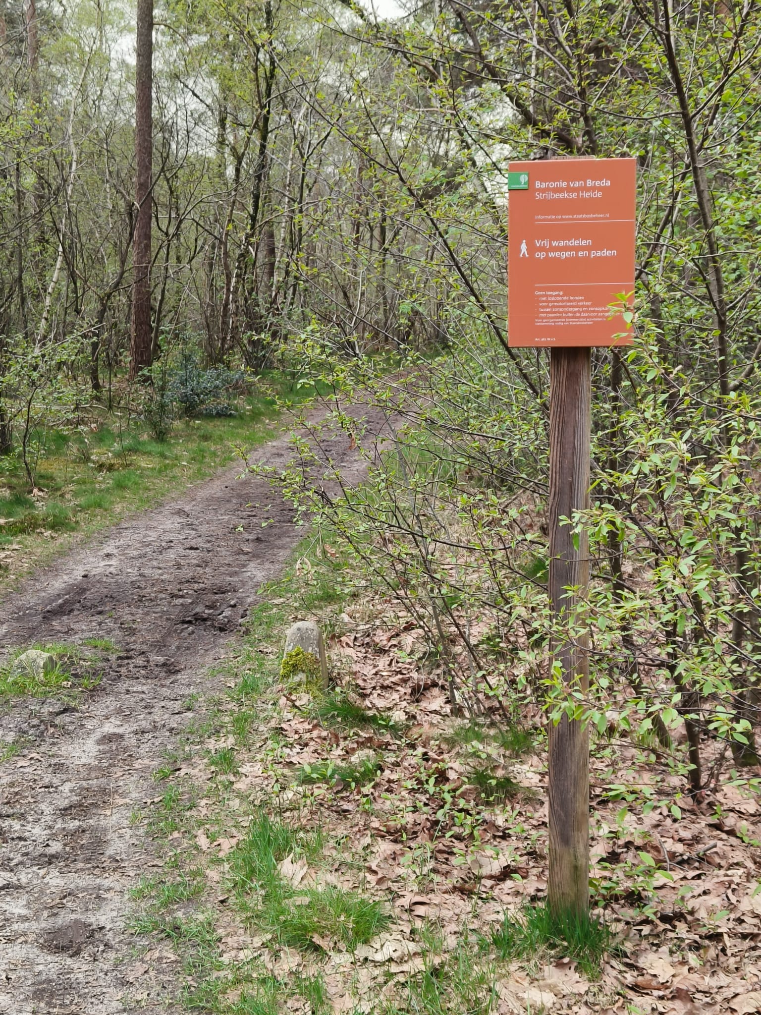 Vlak na de grenspalen komen we al bij onze pauzeplek. Eigenlijk veel te vroeg in de route maar het is tenslotte al lunchtijd en met de vroege start van vandaag lusten we al wel wat. In Strijbeek laten we ons op het zonnige terras verzorgen met een twaalf uurtje en een uitsmijter. We kunnen er weer even tegenaan. En hoe. We komen door landgoederen en natuurgebieden. Strijbeekse Heide, Luchtenburg, Valkenberg, Prinsenbos, Chaamse bossen. Slingerende bospaadjes, een afwisselend schouwspel van bos, heidevelden, en indrukwekkende vennen en beken. Maar ook hier blijkt de overvloedige regenval van de laatste maanden voor veel ondergelopen paden en blubber te hebben gezorgd. We springen van droog plekje naar droog plekje. Met takken zijn er doorwaadbare plaatsen gemaakt. Soms moeten we het pad verlaten om dwars door het struikgewas een ander en droger pad te bereiken. Het lijkt soms meer op een survivaltocht dan een relaxte lange wandeling. Het is dan ook veel zwaarder lopen dan op verharde paden en wegen, vooral ook omdat we een zware rugzak bij ons hebben. We wisselen deze dan ook regelmatig onderling af.