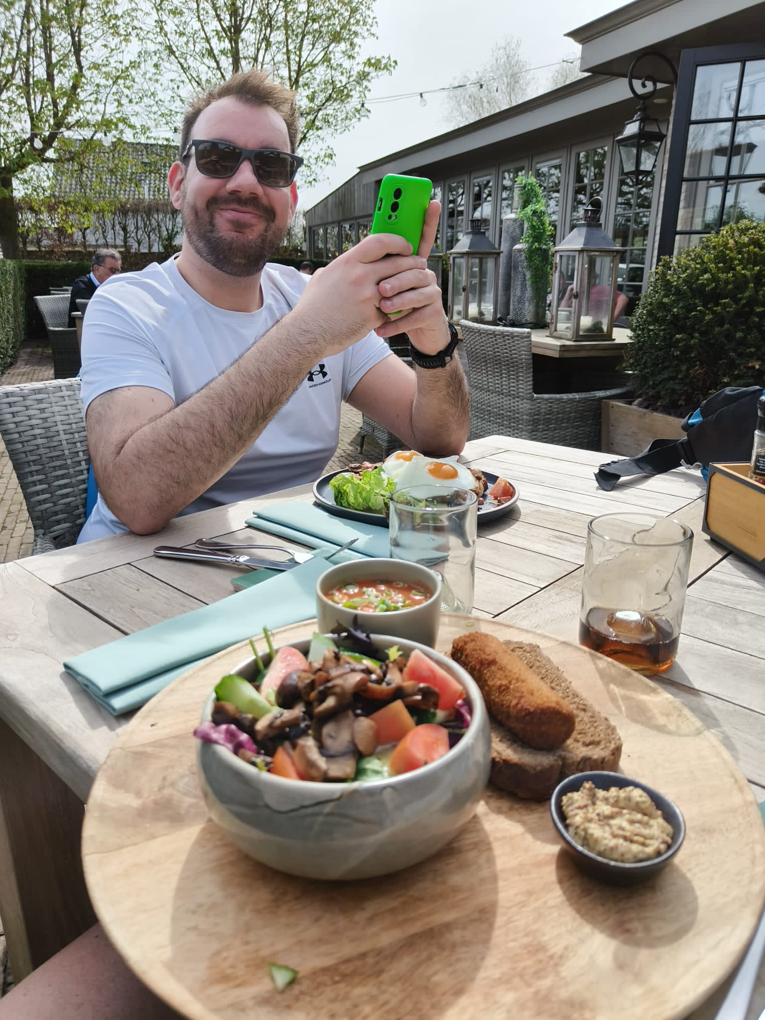 We komen uiteindelijk bij ons eindpunt voor vandaag. Hotel en brasserie “den Engel”. Het hotel blijkt in een bruisend centrum te liggen. Er zijn veel mensen op de been. Heerlijk uit eten in de vele restaurants rondom het centrum of in de bar een pintje pakken. Zoveel drukte en vertier hadden we niet verwacht. Wij willen echter maar één ding. Een douche om het stof van ons af te spoelen en de benen hoog leggen. We zijn flink vermoeid na deze etappe. Thomas grapt nog in de kamer met een foto waarin het hotel wordt gesplitst in een Belgisch en Nederlands deel. Ik word verbannen naar België en moet op het randje van het bed liggen. Terwijl 70% van het bed Nederland is en hij daar kan liggen.