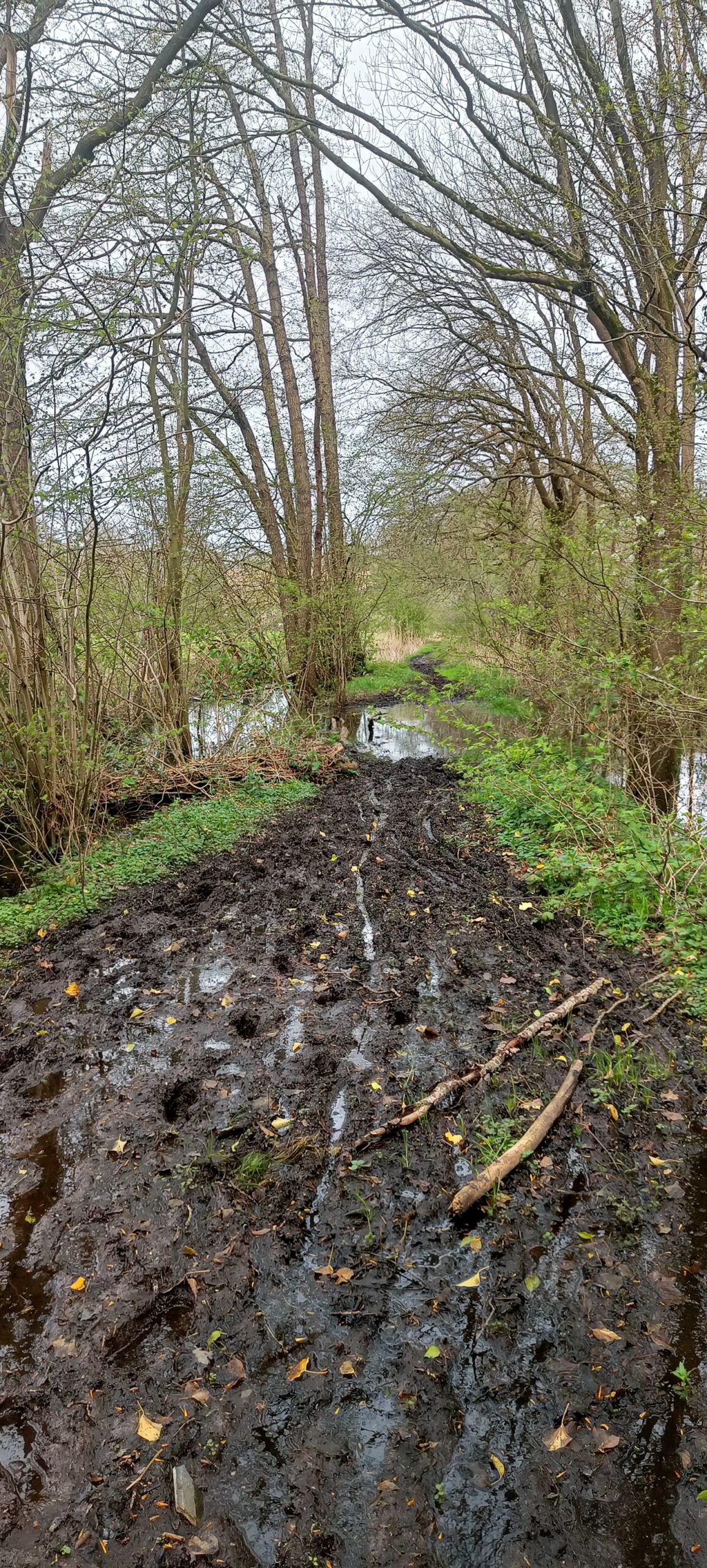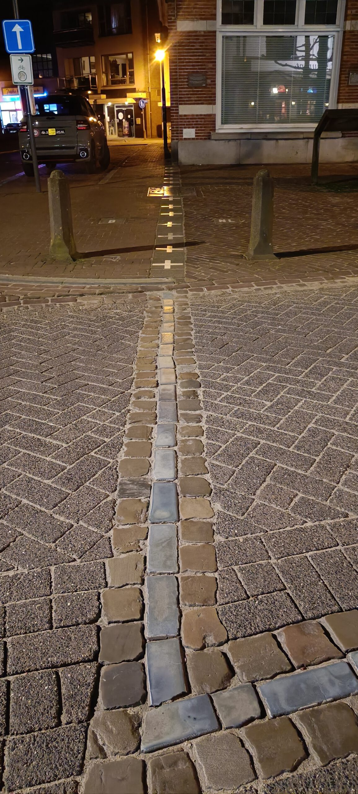 Ter hoogte van Alphen (niet te verwarren met Alphen aan den Rijn) lopen we over één van de vele onverharde wegen richting het Bels lijntje. We zien deze al in het landschap lopen want het is een overblijfsel van de spoorlijn Tilburg – Turnhout en deze ligt op een verhoging. Het is sinds 1990 een fietspad tussen Alphen en Baarle-Nassau. Het spoorlijntje heeft dienst gedaan tussen 1867 en 1982. Lopen op het fietspad is welkom na al het geblubber en geglij. En zo lopen we in de avondschemering het plaatsje Baarle-Nassau binnen.