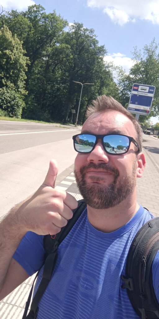 Ron en ik pakken de trein naar Roermond en daar pakken we een klein busje naar Sint Odiliënberg. Het is een 8-persoonsbusje, waar wij persoon 10 en 11 in zijn. Dus we mogen al van geluk spreken dat we mee mochten. Tussen de stoelen in zitten we in het busje op de grond. Niet helemaal veilig, maar we komen er gelukkig wel. Onderweg giet een kind nog het laatste restje cola uit zijn blikje over me leeg, dus dit keer gebruik ik voor de verandering het vochtig toiletpapier eens voor iets anders. Bij de PLUS in Sint Odiliënberg koop ik nog wat proviand voor onderweg en we kunnen vertrekken. Het weer is heerlijk! Blauwe lucht en prima temperatuur! We kunnen echt van geluk spreken, want dit weerbeeld is niet overal in Nederland hetzelfde.
